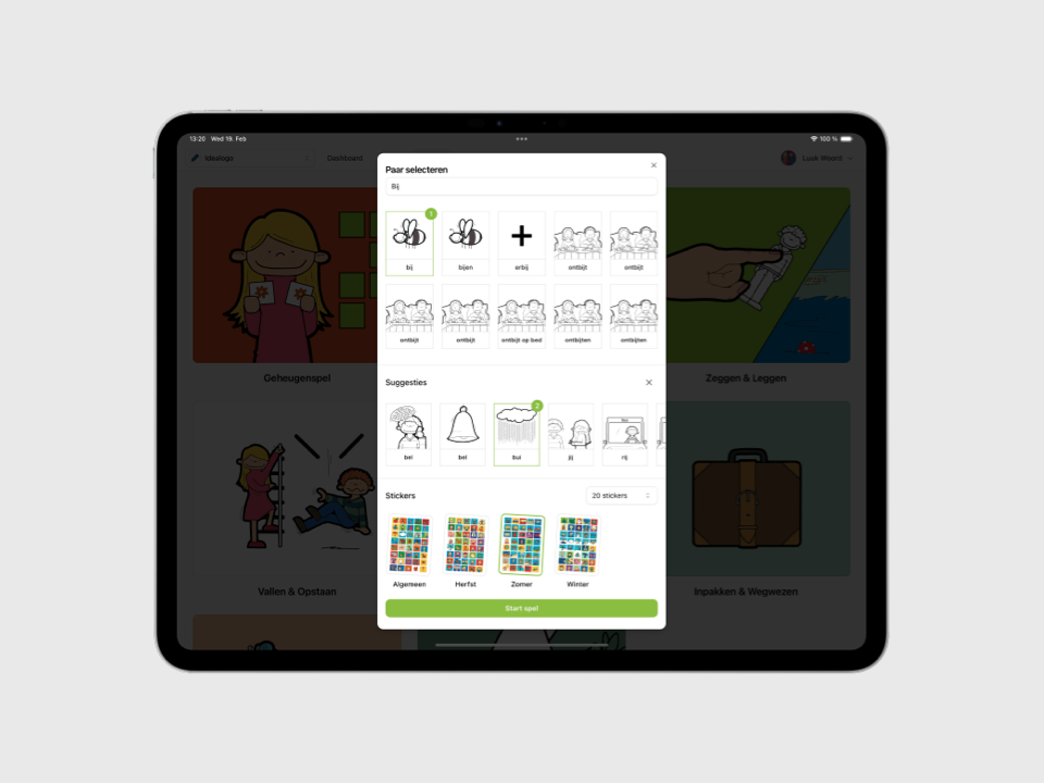 Met de vernieuwde zoekfunctie in Inpakken & Wegwezen vind je nu supersnel minimale paren om te oefenen, geen studio werkblad meer nodig! Kies een woordpaar en het aantal stickers en begin met oefenen.